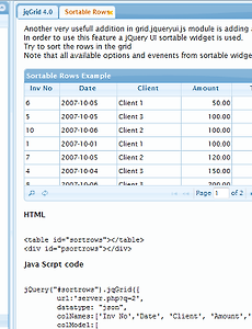 우선 참고 사이트 보기 ( http://trirand.com/blog/jqgrid/jqgrid.html ) [jqGrid Demos] -> [Items] 창에서 [New in version 3.6] -> [Sortable Rows] 참조 나 같은 경우 위와 같은 방식으로 했는데 헤더를 클릭해도 정렬이 안되었다.. --;그래서 아래와 같이 sortable: true와 loadonce : true 를 넣으니 되었다. jQuery("#sortrows").jqGrid({ sortable: true , url:'server.php?q=2', datatype: "json", colNames:['Inv No','Date', 'Client', 'Amount','Tax','Total','Notes'], colModel:..